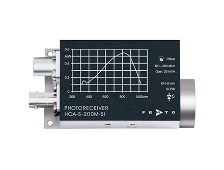 HCA-S-200M型號配備了大面積的硅(Si-PIN)和銦鎵砷(InGaAs-PIN)光電二極管,光譜范圍320nm-1000nm / 900nm-1700nm,集成放大器的跨阻為2 x 10^4 V/A,這使得在1550nmInGaAs型號實現(xiàn)了最大1.9 x 10^4 V/W的轉(zhuǎn)換增益。多級直流耦合放大器允許從直流(DC)到最大200MHz帶寬的測量,對應(yīng)最小上升時間為1.8ns。通過低噪聲設(shè)計,實現(xiàn)了僅為5.2pW/√Hz的最小噪聲等效功率(NEP),這使得能夠直接檢測到微瓦級別的短脈沖信號,無需額外的信號處理。